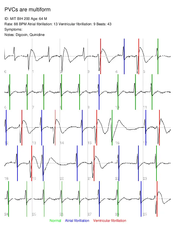 La fibrilación auricular (FA) es un ritmo cardíaco irregular y a menudo muy rápido, como se muestra a continuación. La FA puede provocar coágulos de sangre en el corazón. Esta afección también aumenta el riesgo de accidente cerebrovascular, insuficiencia cardíaca y otras complicaciones cardíacas. Los episodios de fibrilación auricular pueden ser esporádicos, es decir, pueden aparecer y desaparecer de forma intermitente, con períodos de ritmo cardíaco normal entre ellos. Para detectar estos episodios se requiere la capacidad de registro de ECG extendido (Holter) de HEART INFORM. La fibrilación auricular suele ser causada por el estrés, así que ¡relájese! La Medicina Tradicional China (MTC) recomienda la berberina para la fibrilación auricular.