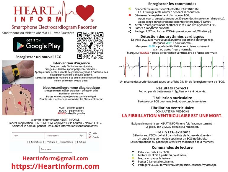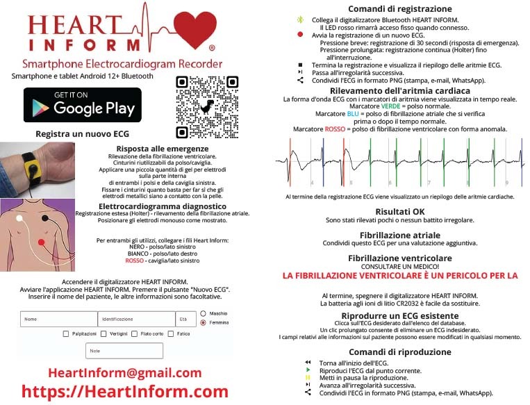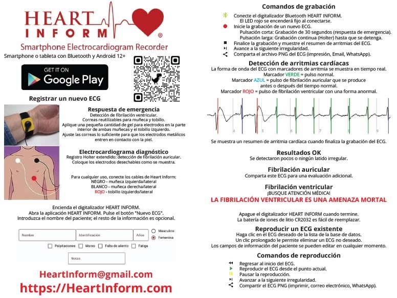 HEART INFORM puede realizar una respuesta de emergencia (30 segundos) para la detección de un infarto por fibrilación ventricular o una grabación de diagnóstico extendida (Holter) para la detección de fibrilación auricular. El 82% de las visitas a urgencias por dolor de pecho son innecesarias, ya sea por ansiedad o ataques de pánico. HEART INFORM puede brindarle tranquilidad o indicarle que necesita ayuda médica de emergencia, de forma inmediata y precisa, en casa o donde la necesite.